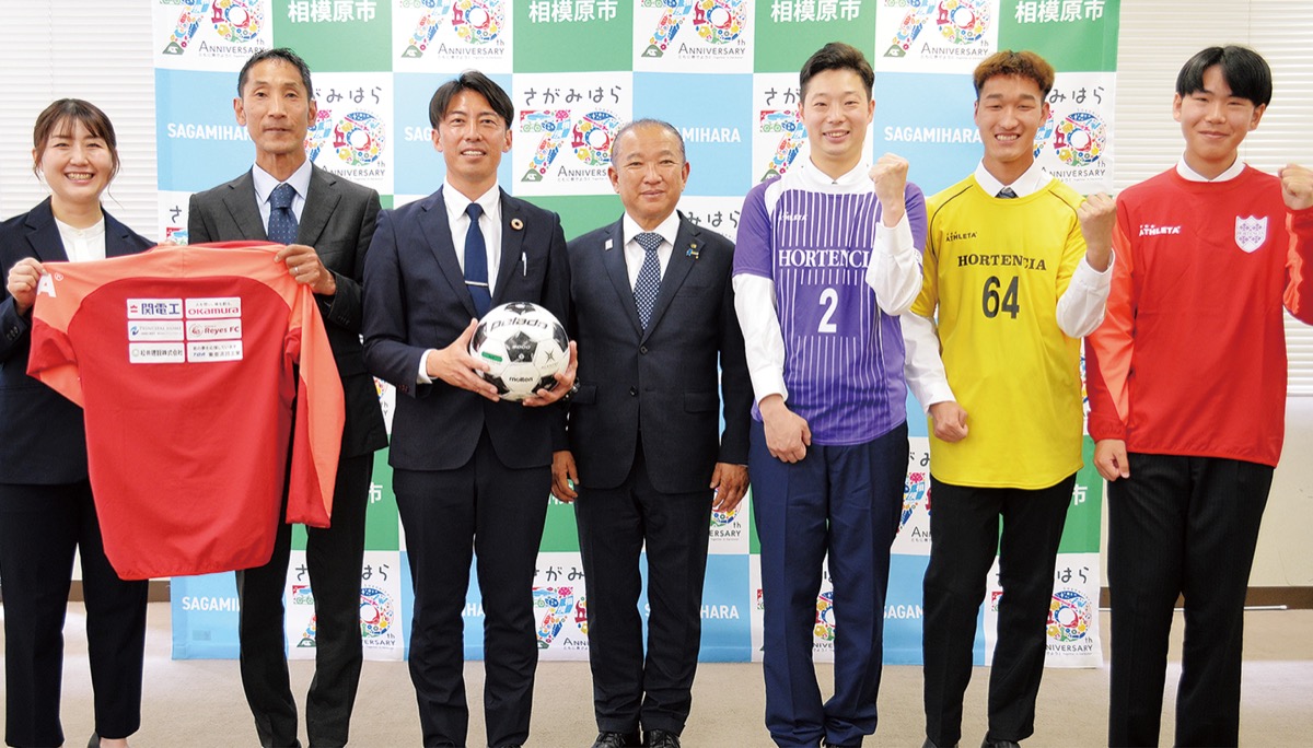 佐栁さんらスタッフと選手が4月11日、相模原市役所を訪れ、本村賢太郎市長にリーグ参加の報告をした。キャプテンの中村雄大さん(29)は「自分はサッカーがめっちゃ大好き。このチームにもっといっぱい人が入ってほしい」とあいさつした。