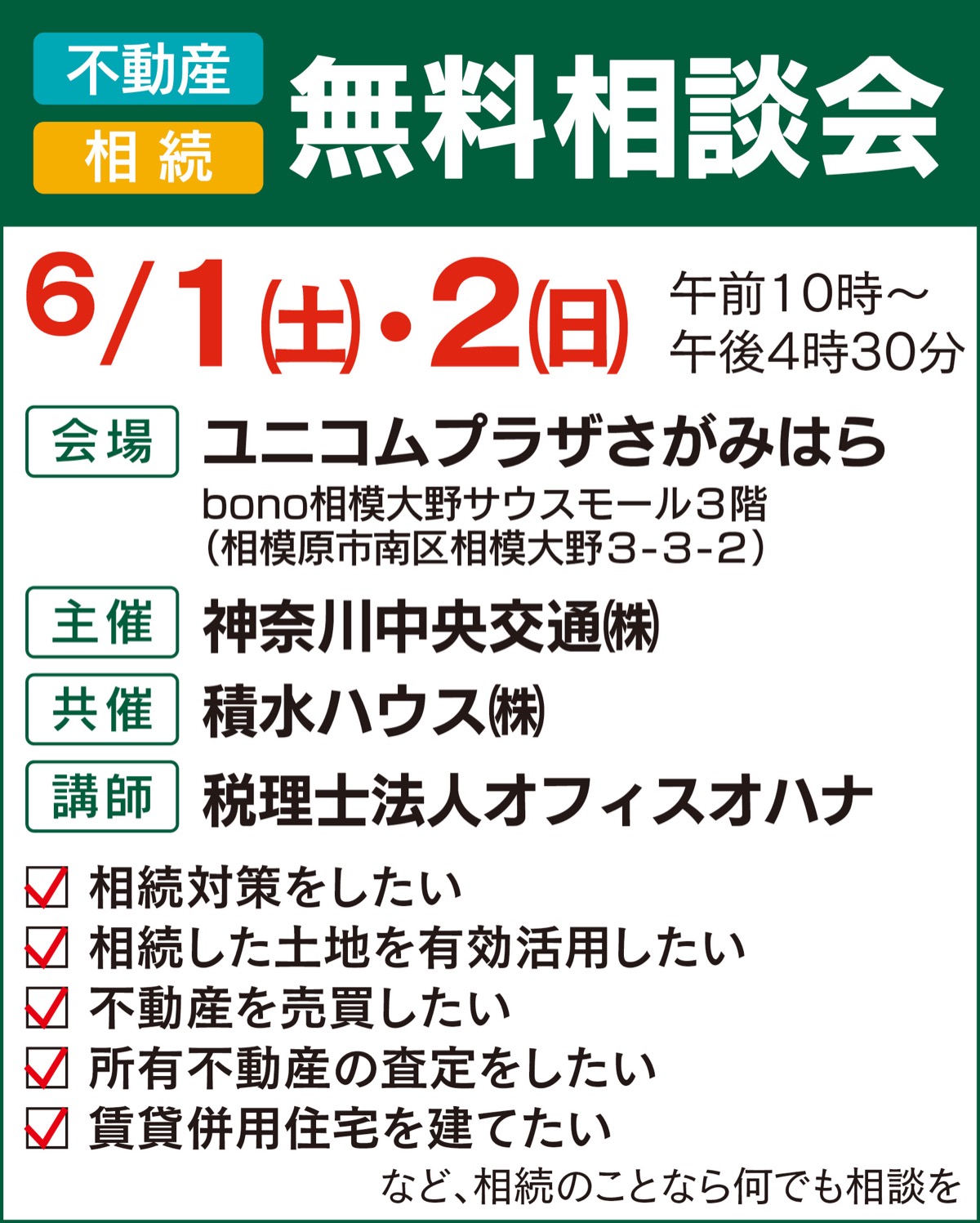 所有する不動産の効果的な売却や有効活用に役立つ無料相談会が、6月1日(土)・2日(日)に相模大野駅前のユニコムプラザさがみはらで開かれる。神奈川中央交通と積水ハウス、税理士が連携し、様々な視点から所有する不動産について最適なアドバイスを提供する。