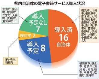 未導入は17自治体だった。「電子書籍の利用は回数や期間に制限があり、永続性に欠ける」(寒川町)、「(書籍の)種類が少ない」(大井町)などを理由に現時点で導入予定なしとするのは7自治体。「導入予定がある」は8自治体。時期を示したのは今年度中に導入予定の横須賀市のみ。