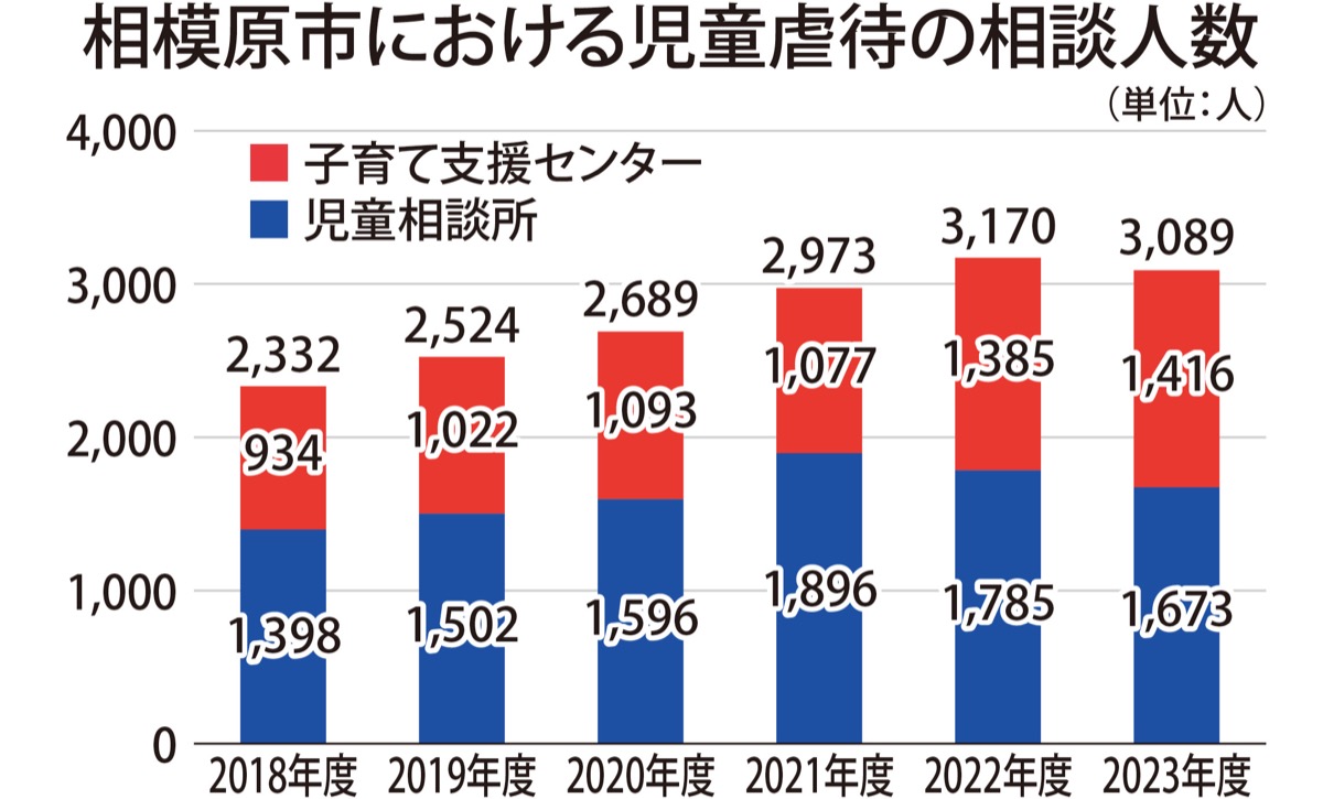 児童虐待の相談人数は全国的に増加が続き、相模原市でも22年度は過去最多の3170人を記録した。市では10年に児童相談所(児相)を設置。17年に各区に子育て支援センターを設置し相談窓口を一元化するなどの環境整備を進めてきた。