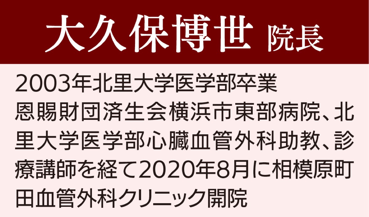 同院の大久保博世院長は心臓血管外科専門医として、下肢静脈瘤の日帰り手術を行っている。下肢静脈瘤とは足の静脈が太くなって瘤(こぶ)状に浮き出て見えるようになった状態。命に別状はないが、見た目やだるさ、痒みなどの症状に悩まされる人が多いという。