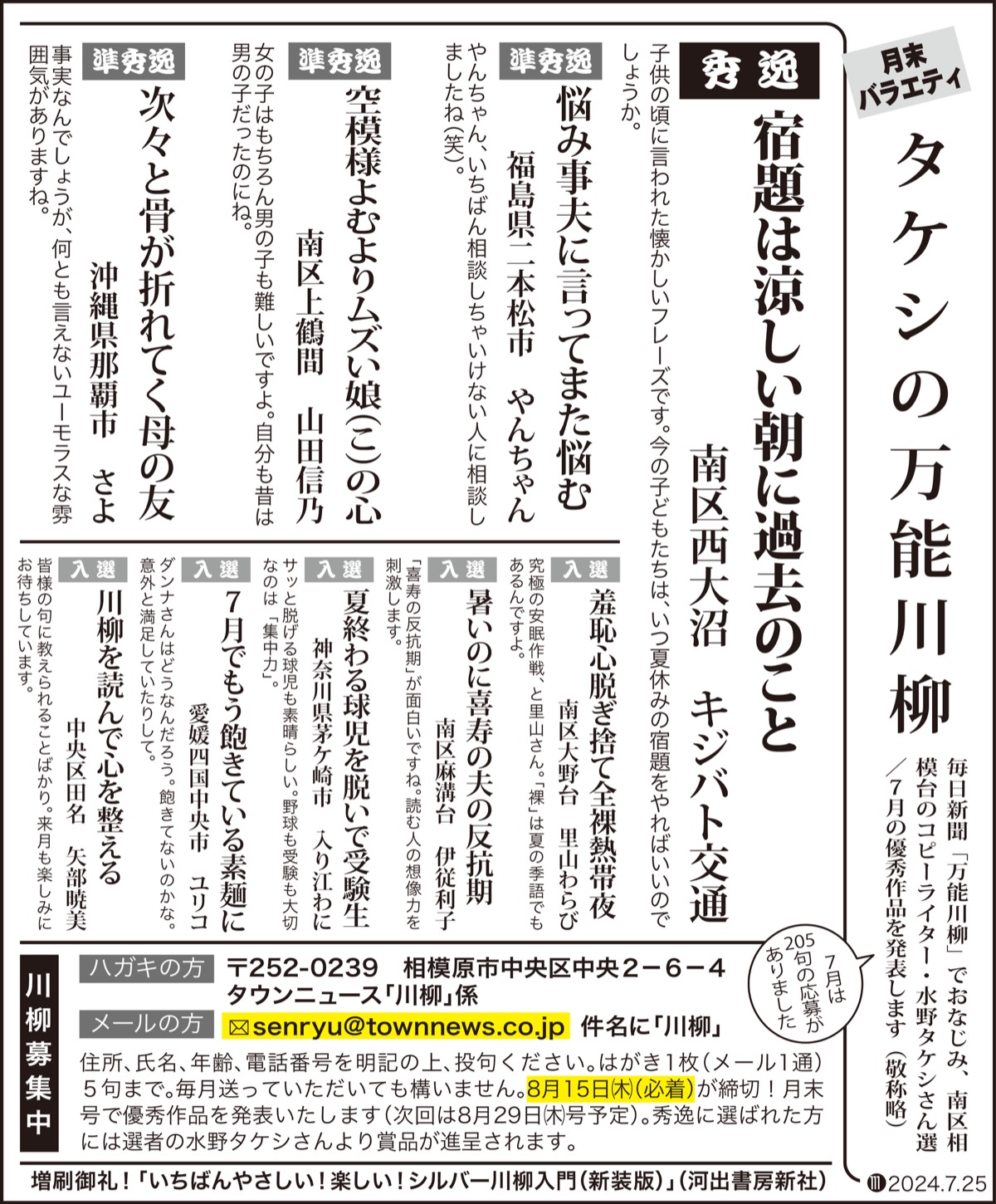 タウンニュース相模原支社では毎月月末号に掲載される「タケシの万能川柳」の川柳を募集しています。投句いただいた作品は毎日新聞「仲畑流万能川柳」などでおなじみの水野タケシさんが選句します。応募方法は左記枠内に。