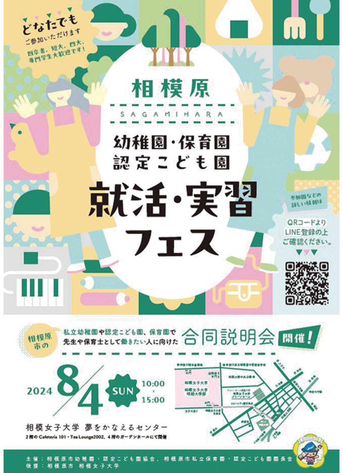 「相模原 幼稚園・保育園・認定こども園就活・実習フェス」が8月4日(日)、相模女子大学で開かれる。事前申し込みは不要で当日直接会場へ。
