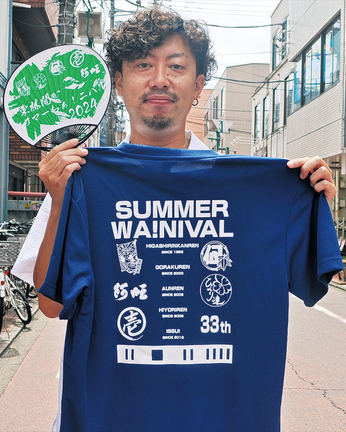今年のうちわのデザインは第1回と同じ緑色。コロナの影響を受け、5年振りの「完全復活」となることから、「原点回帰」をテーマにしたデザインとなった。ひらがなの「わ」にも漢字の「和」にも見える文字に、東林間5連のロゴが描かれている。うちわやTシャツに必ずこの5連のロゴを入れることが、石田さんのこだわりだ。