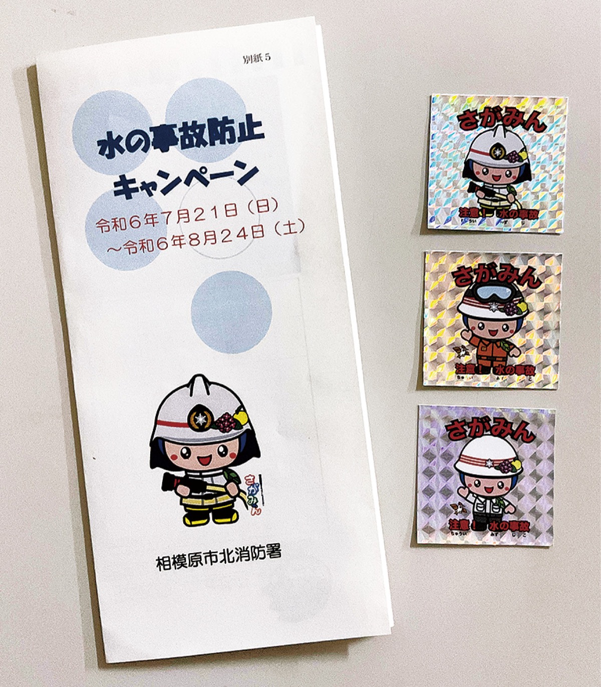 水の事故防止に係るリーフレットを上大島キャンプ場などに配架。消防車による巡回活動の際には、さがみんの限定シールを配布して、水の事故防止へ啓発に努めている(なくなり次第終了)。