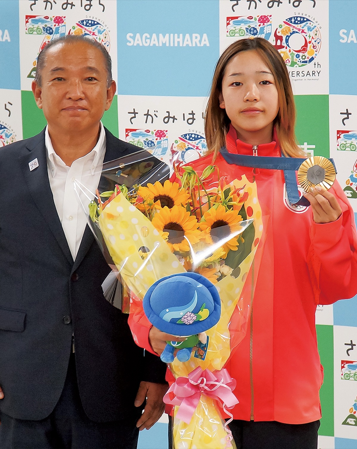 吉沢選手は首に金メダルをかけ、スケートボードを手に日本代表の赤いジャージ姿で会場に登場。待ち受けた本村市長から花束と市のマスコットキャラクターを受け取り、祝福を受けた。