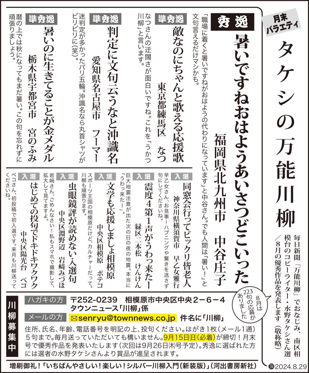 タウンニュース相模原支社では毎月月末号に掲載される「タケシの万能川柳」の川柳を募集しています。投句いただいた作品は毎日新聞「仲畑流万能川柳」などでおなじみの水野タケシさんが選句します。応募方法は左記枠内に。
