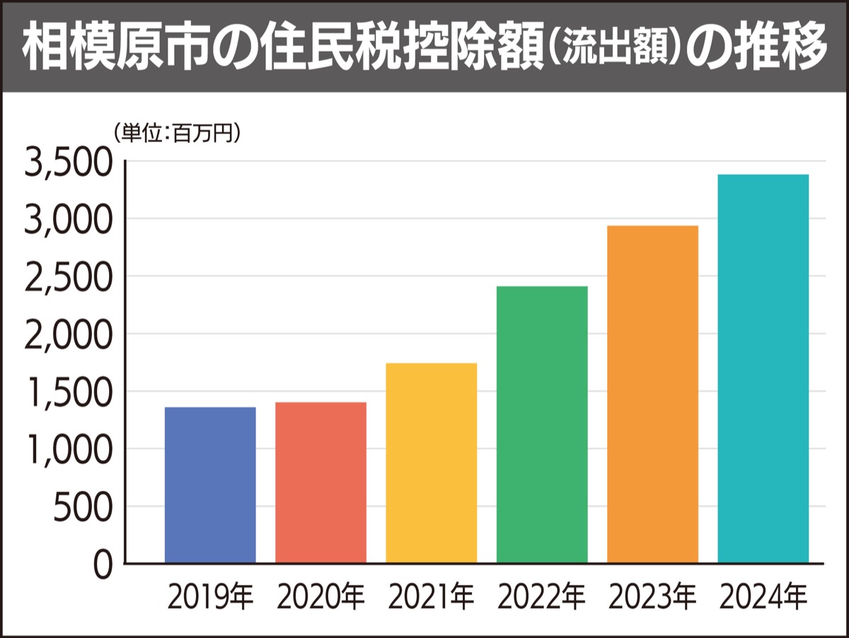 相模原市の住民税控除額は24年度、過去最多の33億6617万円を記録。前年度と比べて4億円以上増加しており、県内では横浜市、川崎市に次いで3番目に多い結果となった。