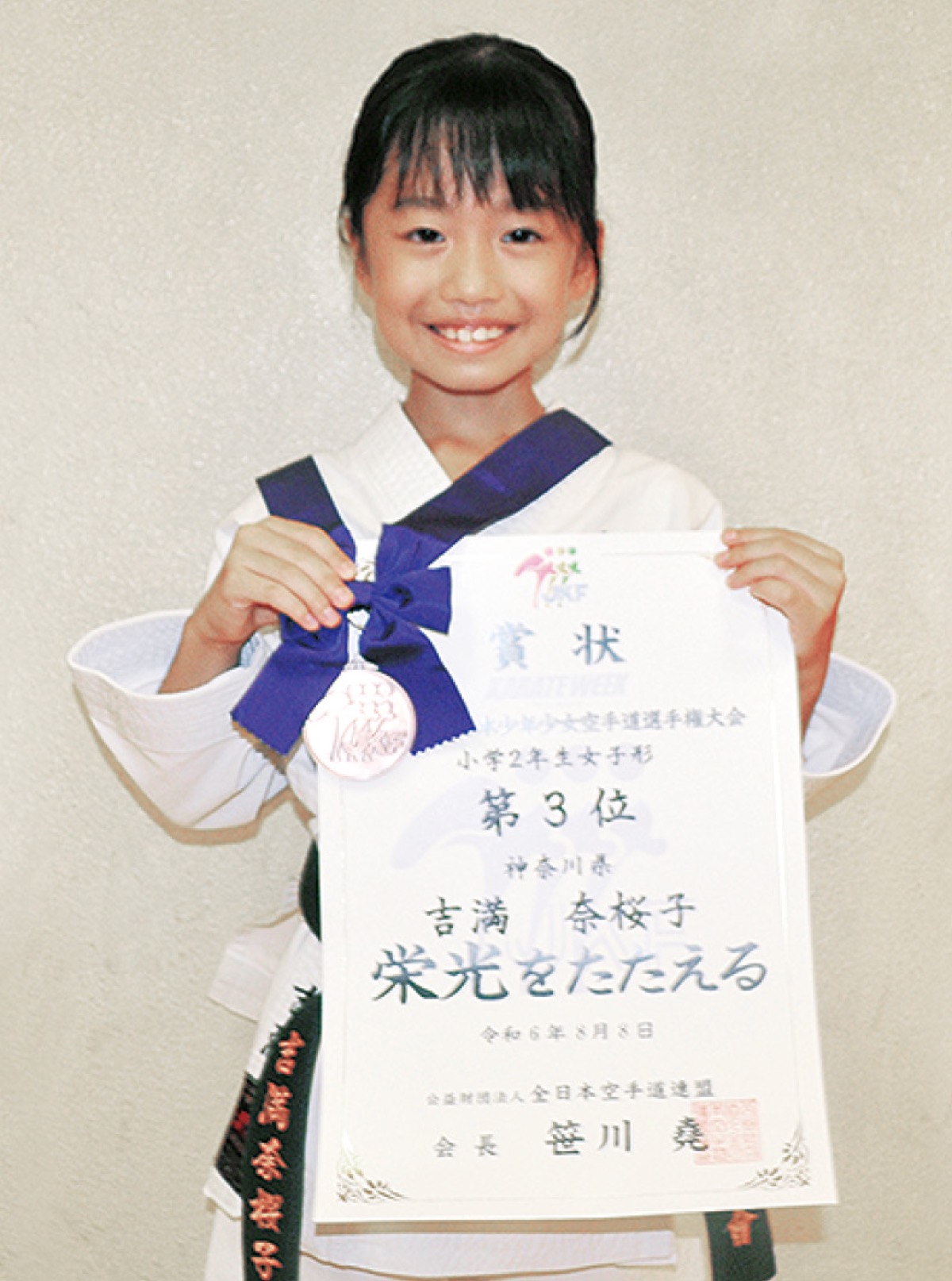 市内に道場を構える空手道「翔成會」所属の吉満奈桜子さん(大野小2年)が、8月8日に東京都で行われた第24回全日本少年少女空手道選手権大会小学校2年生女子形の部で第3位となった。