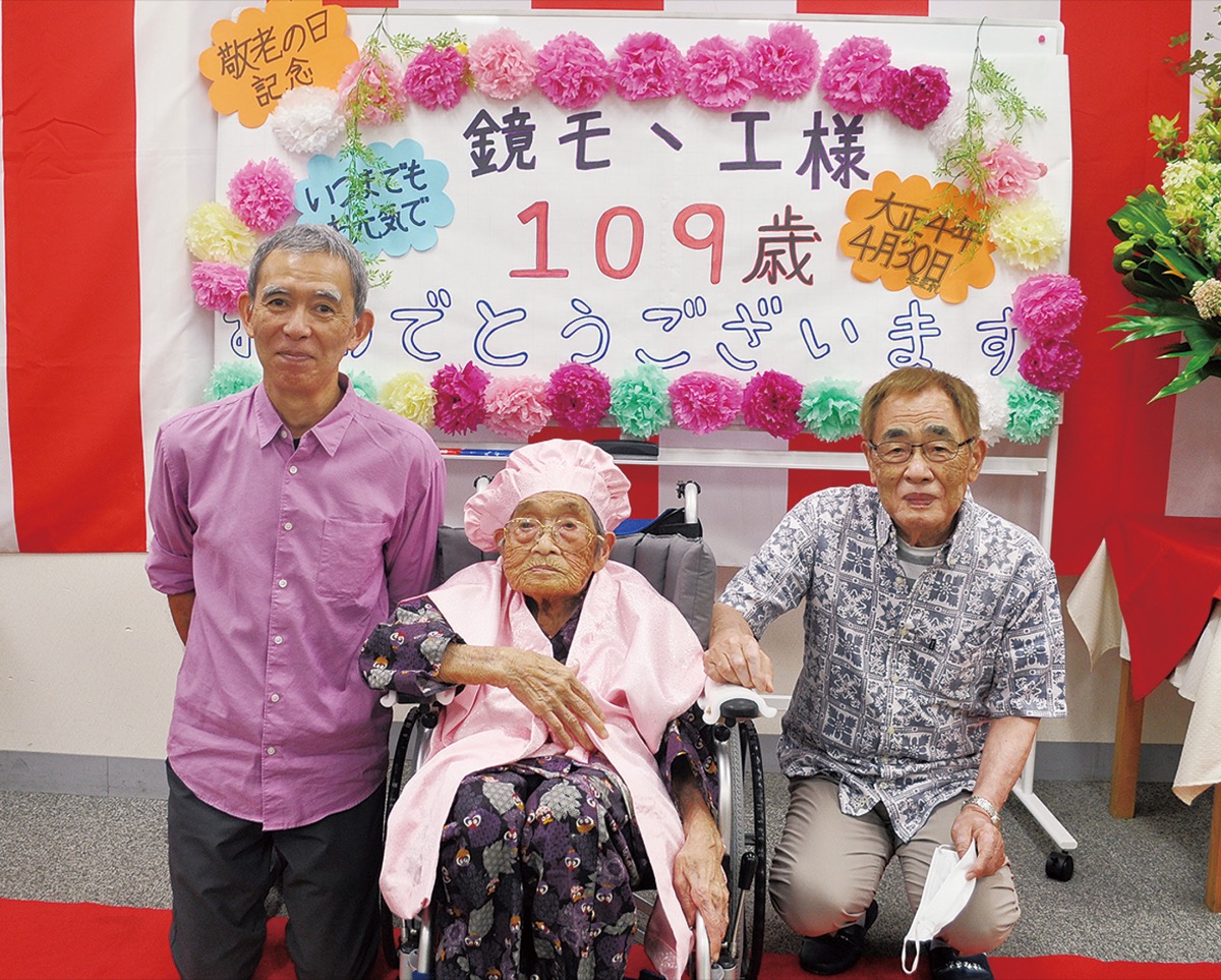 当日、本村市長から鏡さんへ記念品が贈呈された。家族や施設職員に祝われ「恥ずかしい」と照れ笑いを浮かべる鏡さん。その様子を息子の隆治さん(87)が嬉しそうにスマートフォンのカメラにおさめていた。
