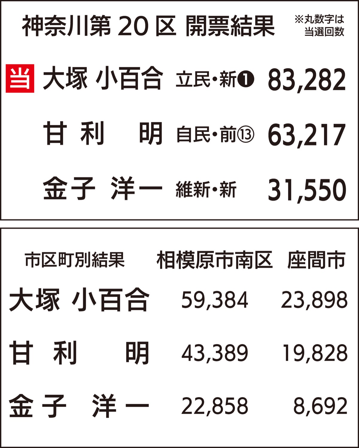 「第50回衆議院議員総選挙」が10月27日に投開票され、神奈川20区(相模原市南区・座間市)では立憲民主党の新人・大塚小百合氏(44)が8万3282票を獲得し、三つ巴の戦いとなった小選挙区を制した。自民党元幹事長で当選13回の前職・甘利明氏(75)は73歳定年制のため比例代表との重複立候補はなく落選した。日本維新の会の新人・金子洋一氏(62)は議席獲得に至らなかった。