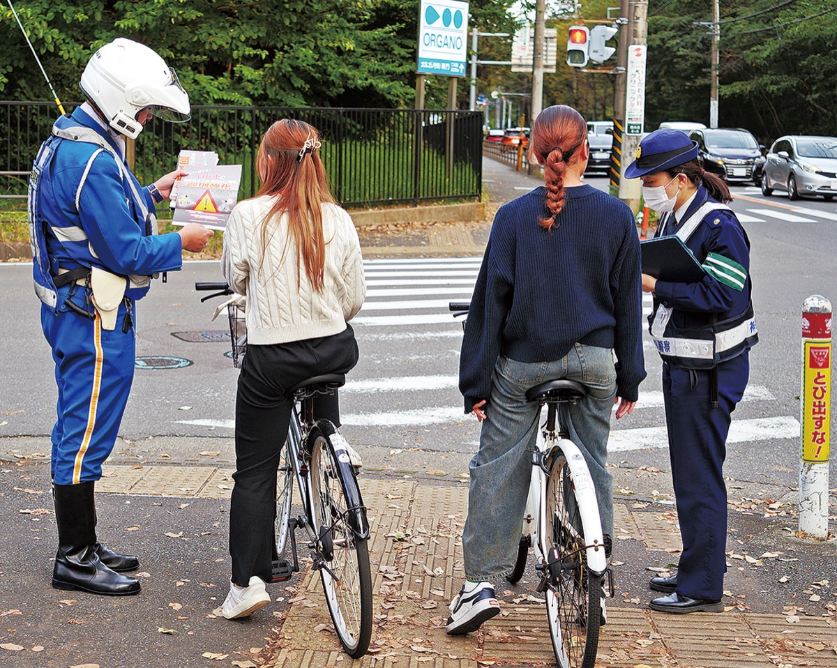 帰宅途中の学生らを中心に、同署の署員と第二交通機動隊白バイ隊員がチラシ約300枚を手渡した。木もれびの森入口交差点は高校や大学があることから、通学自転車の往来が多く、2019年に自転車と大型貨物車の衝突による死亡事故が発生している。チラシを受け取った70代の男性は「自転車ではなくても、スマホを見ながら歩く人やヘッドホンしている人は注意が周囲に向いていなく危ないなと感じる。取り締まるのはいいことだと思う」と語る。