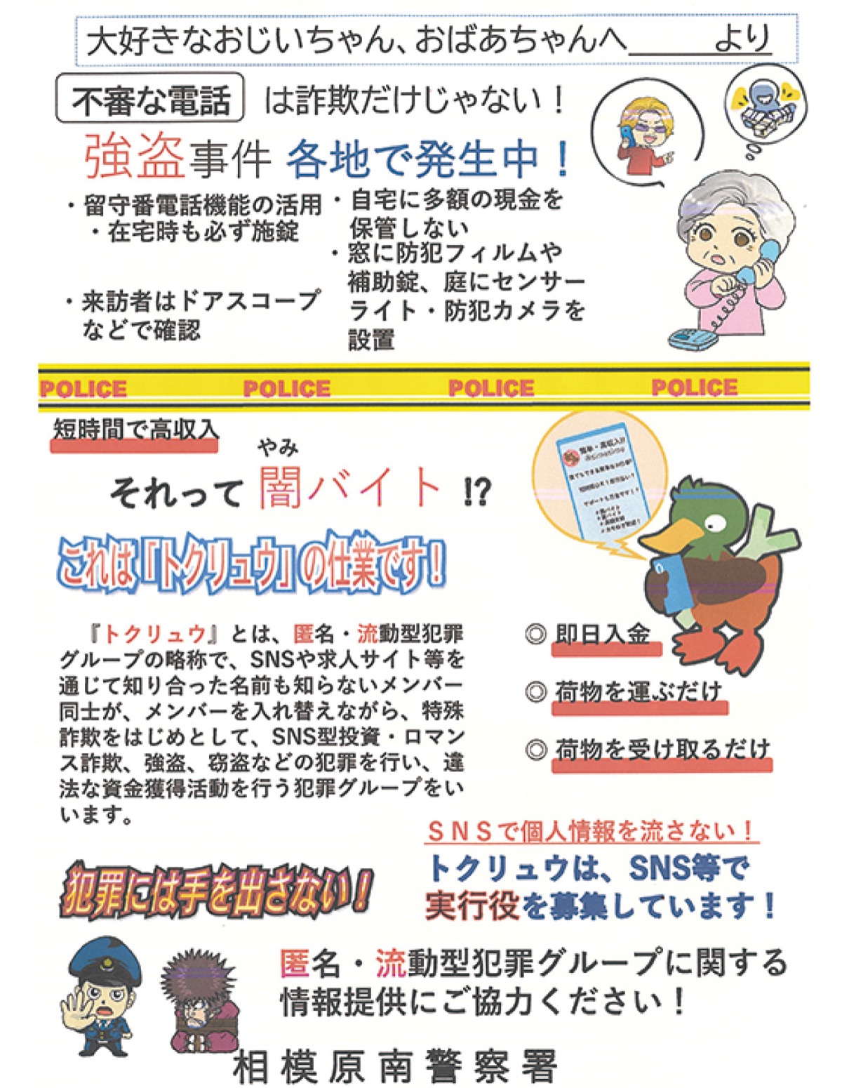 首都圏で発生する強盗事件を受けて相模原南警察署は、緊急で相模原市の「安全安心メール」の発信やチラシ配布による注意喚起を行っている。