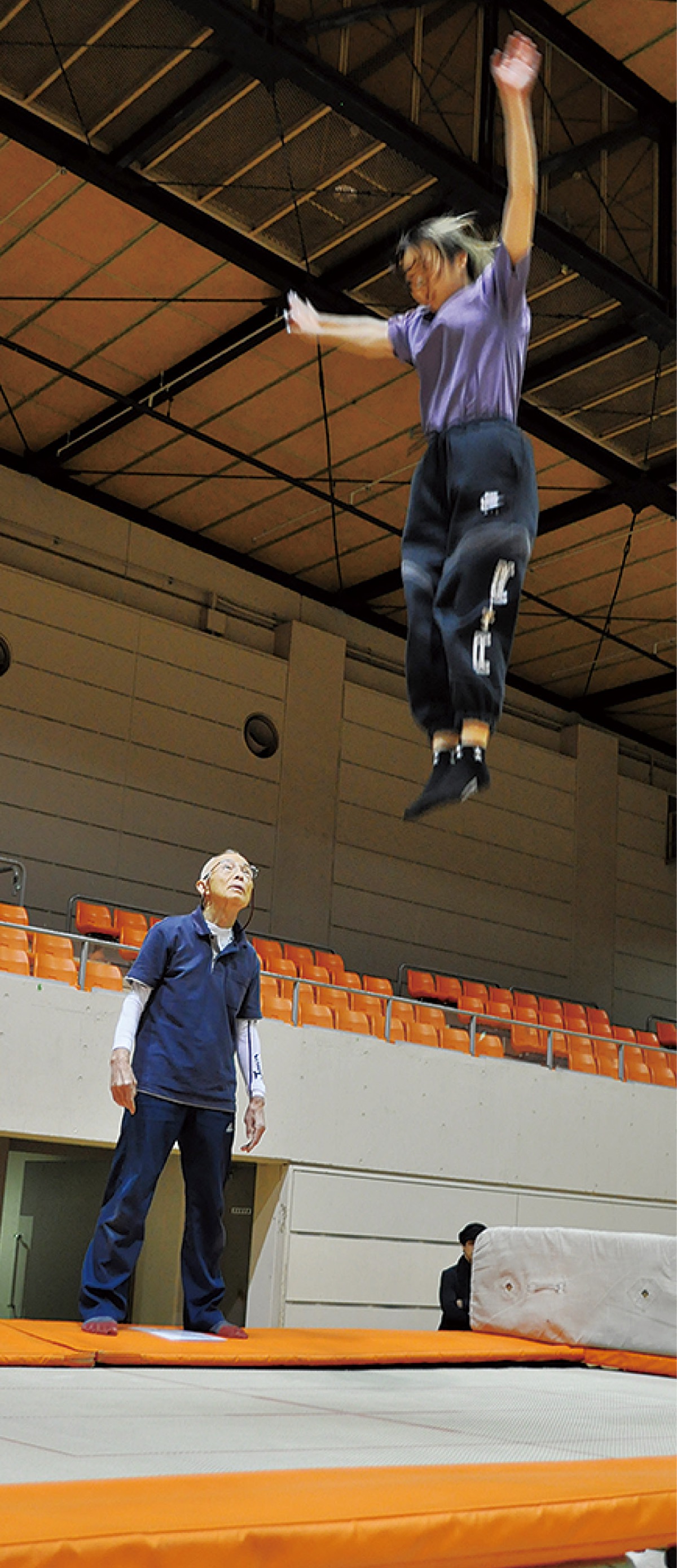 中学1年生の時から練習に参加している掛谷友愛さん(高校1年生)は「跳ぶ感覚をつかむのが難しい。少しでもブレたら失敗してしまう」と話すも、練習できれいな宙返りを見せていた。