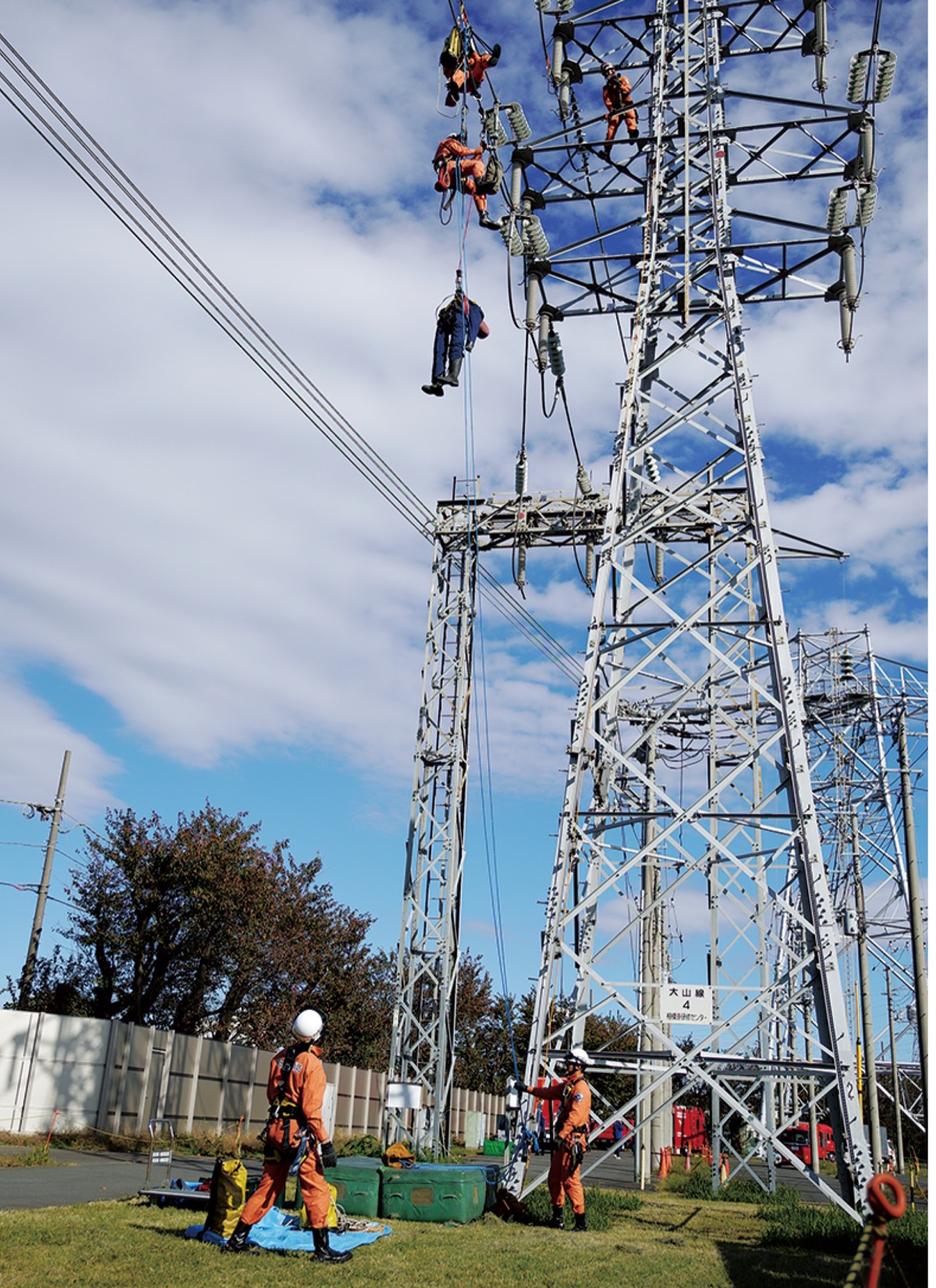 訓練では送電線や鉄塔に関する座学も行われ、訓練に参加した小田原市消防本部の遊作竜哉さんは「こうした施設で訓練をする機会はなかなかない。専門の方から鉄塔の渡り方、上り方などを教わることができるのはありがたい」と語った。