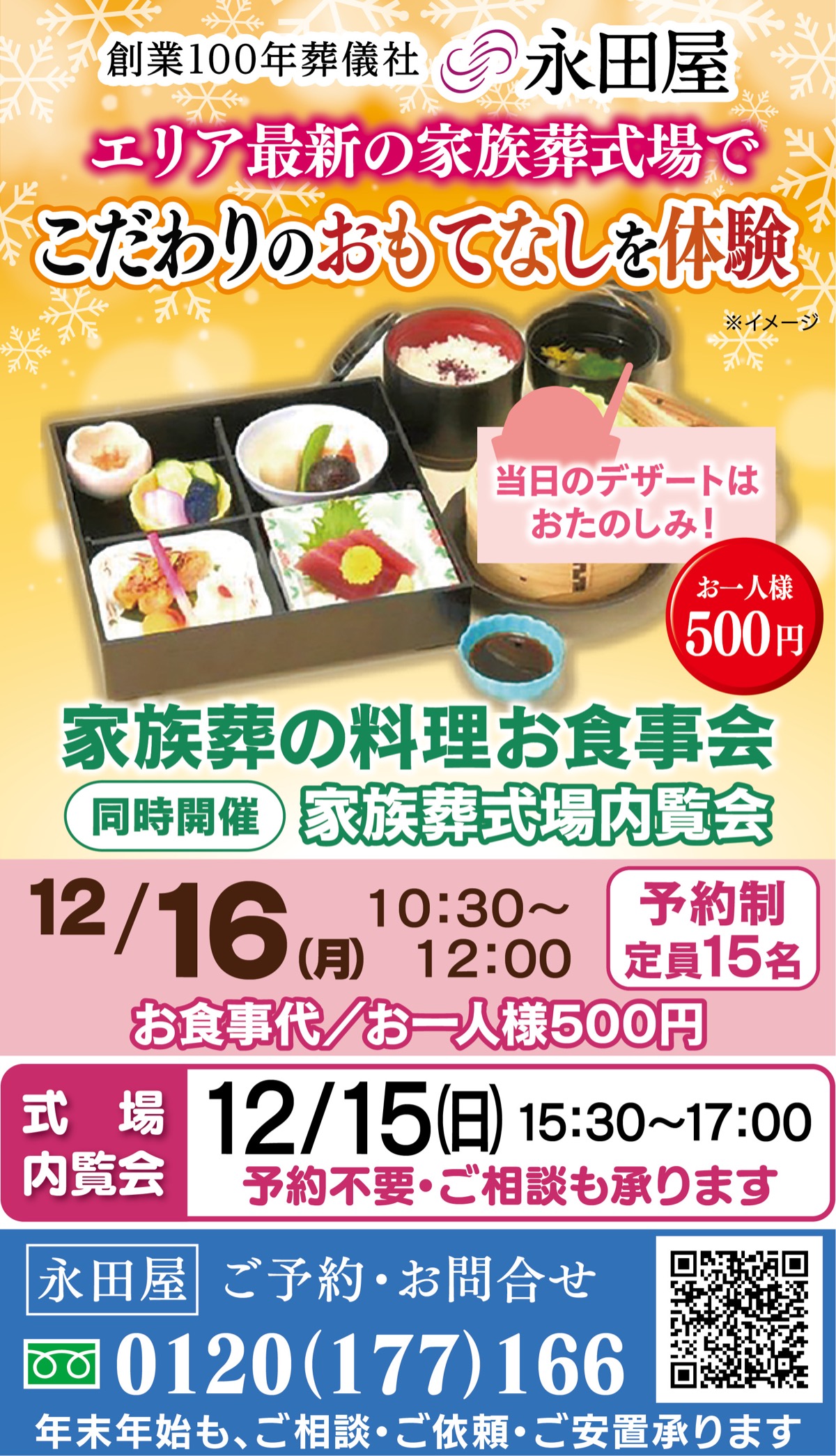創業百十一年目、町田・相模原エリアでナンバーワンの11拠点を構える地元の老舗葬儀社・永田屋が、「家族葬の料理お食事会」を12月16日(月)に小さな家族葬ハウス(R)上鶴間で開催する。