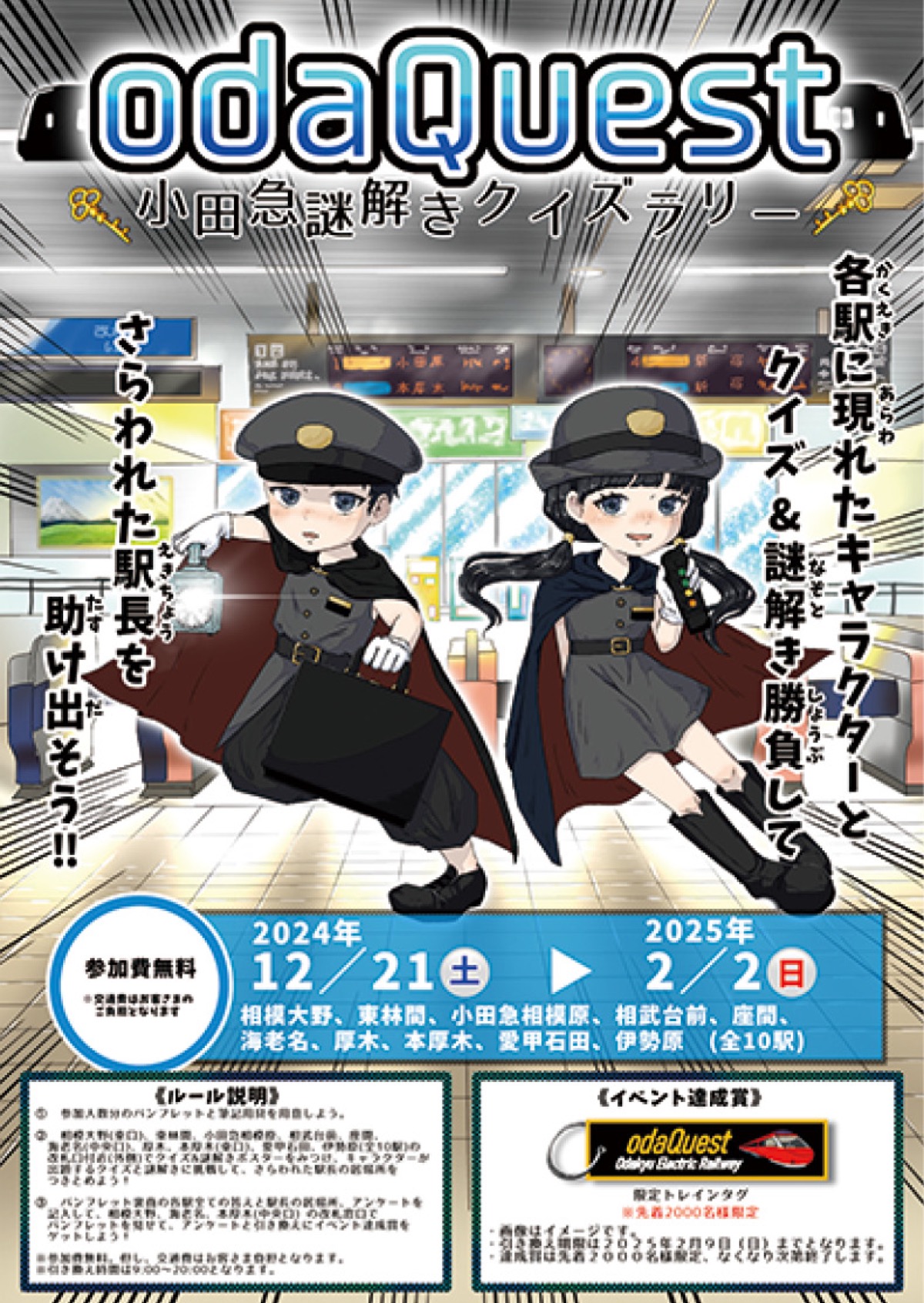 小田急線10駅を巡る謎解きクイズラリー「odaQuest」が、12月21日(土)から2025年2月2日(日)まで開催される。主催は相模大野管区。「各駅に現れたキャラクターとクイズ&謎解き勝負をして、さらわれた駅長を助け出そう!」がテーマとなっている。