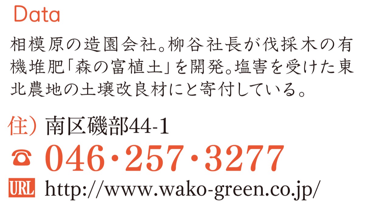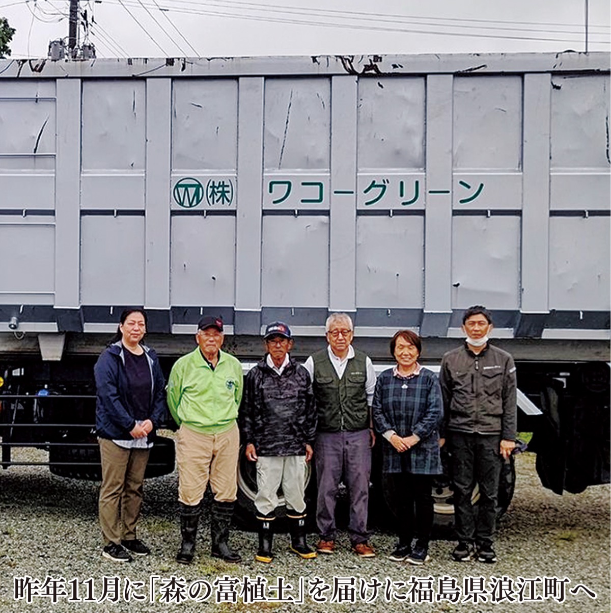 南区磯部にある造園会社、株式会社ワコーグリーンの代表、柳谷和幸さんがその人。東京電力の送電施設敷地内から出た伐採木を原料に、独自の製法で「森の富植土」という有機堆肥を開発。1回約10トン、片道5時間かけて年に4、5回福島県浪江町に届けている。