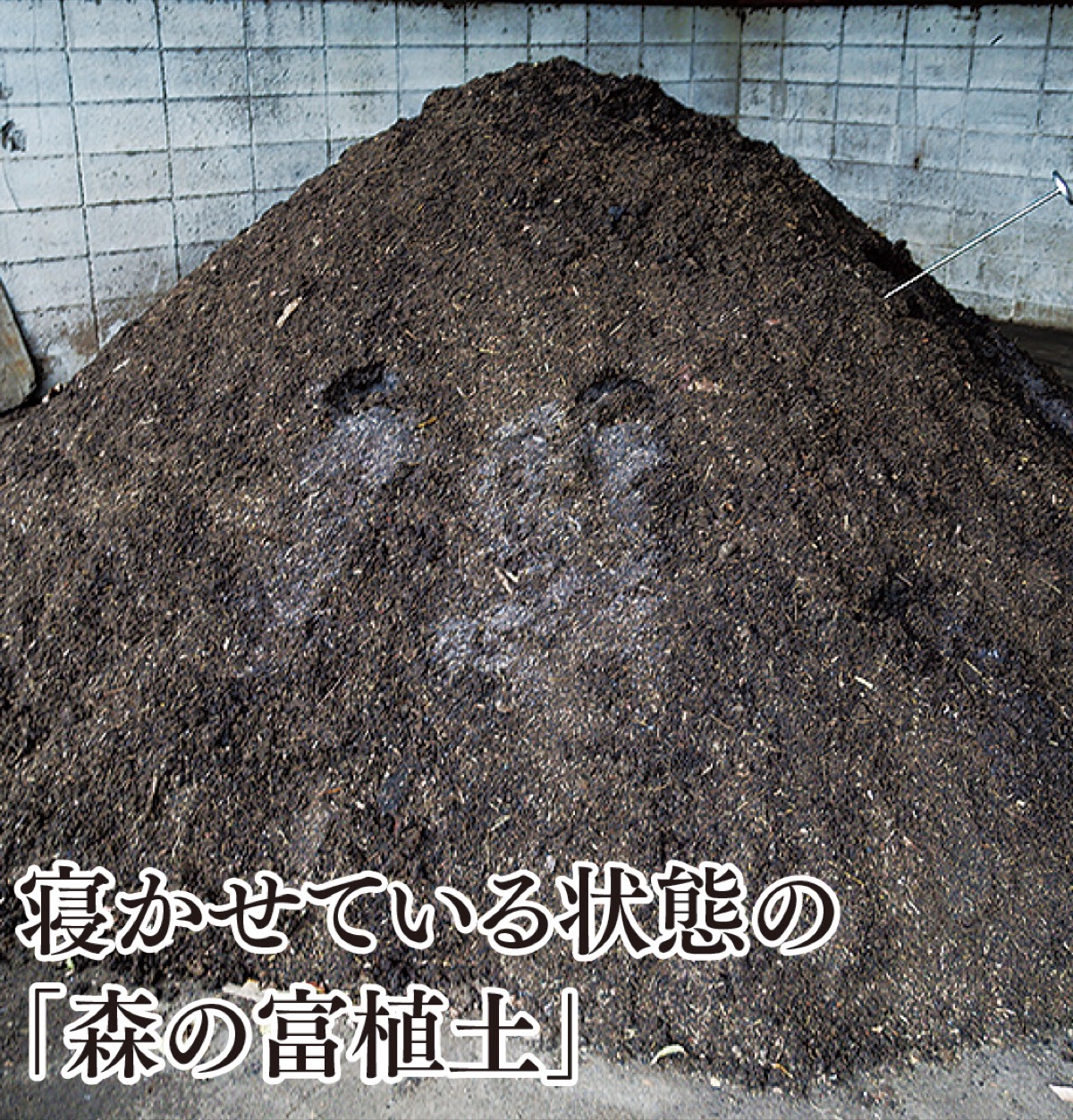 「森の富植土」ができたのは2009年。当時、年間1千万円を超える剪定枝や伐採枝の処理費用を抑えたいと柳谷さんが開発した。100%天然成分のミネラル液と剪定枝を混ぜて3カ月程寝かせ、発酵、攪拌させる。土に混ぜると窒素やリンを豊富に含んだ土壌に改良されると専門機関で実証されている。