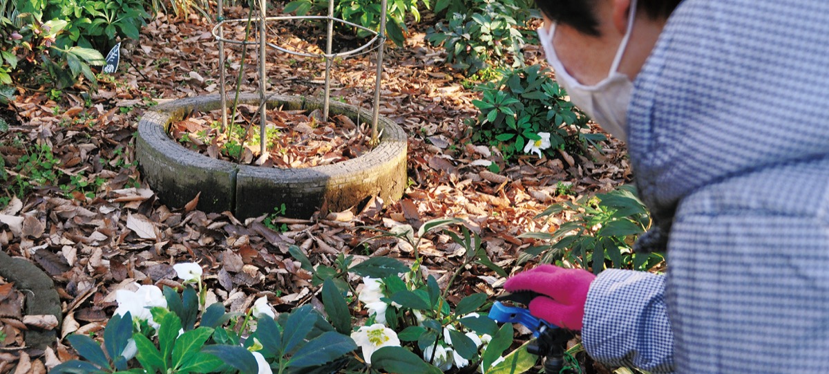 クレマチスやあじさいと並ぶ、同園の三大名花のひとつ。咲く花が少ない冬の時期に、まるで寒さに耐えるように上を向かず、下を向いてひっそりと咲くのが特徴だ。