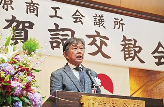 相模原商工会議所の令和7年新年賀詞交歓会が1月9日、けやき会館で行われ、およそ200人の商工業関係者らが集まり新年を迎えた喜びを分かち合った。