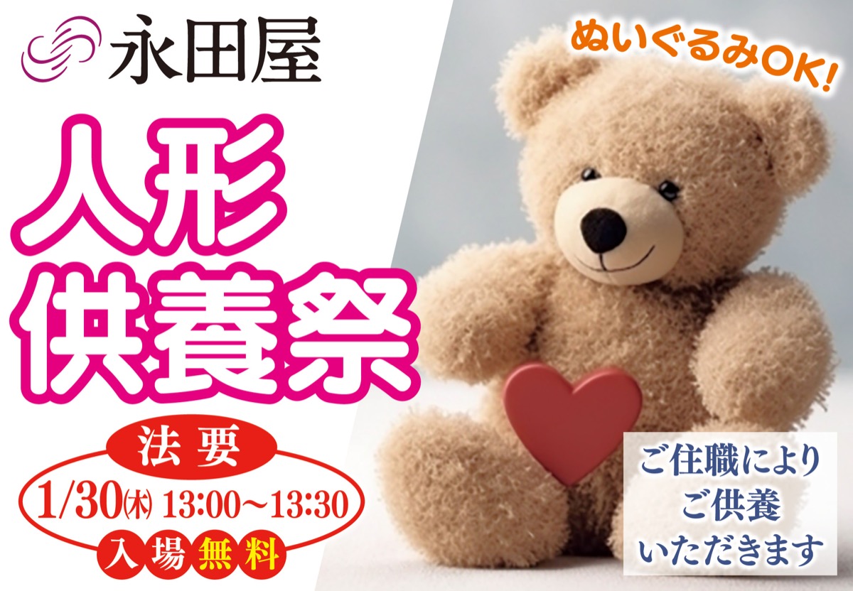 創業百十二年目、相模原・町田で11拠点を構える葬儀社・永田屋は小さな家族葬ハウス(R)若松で人形供養祭を開催。1月25日(土)、26日(日)、29日(水)、30日(木)に引き取りを受付ける。事前予約制。