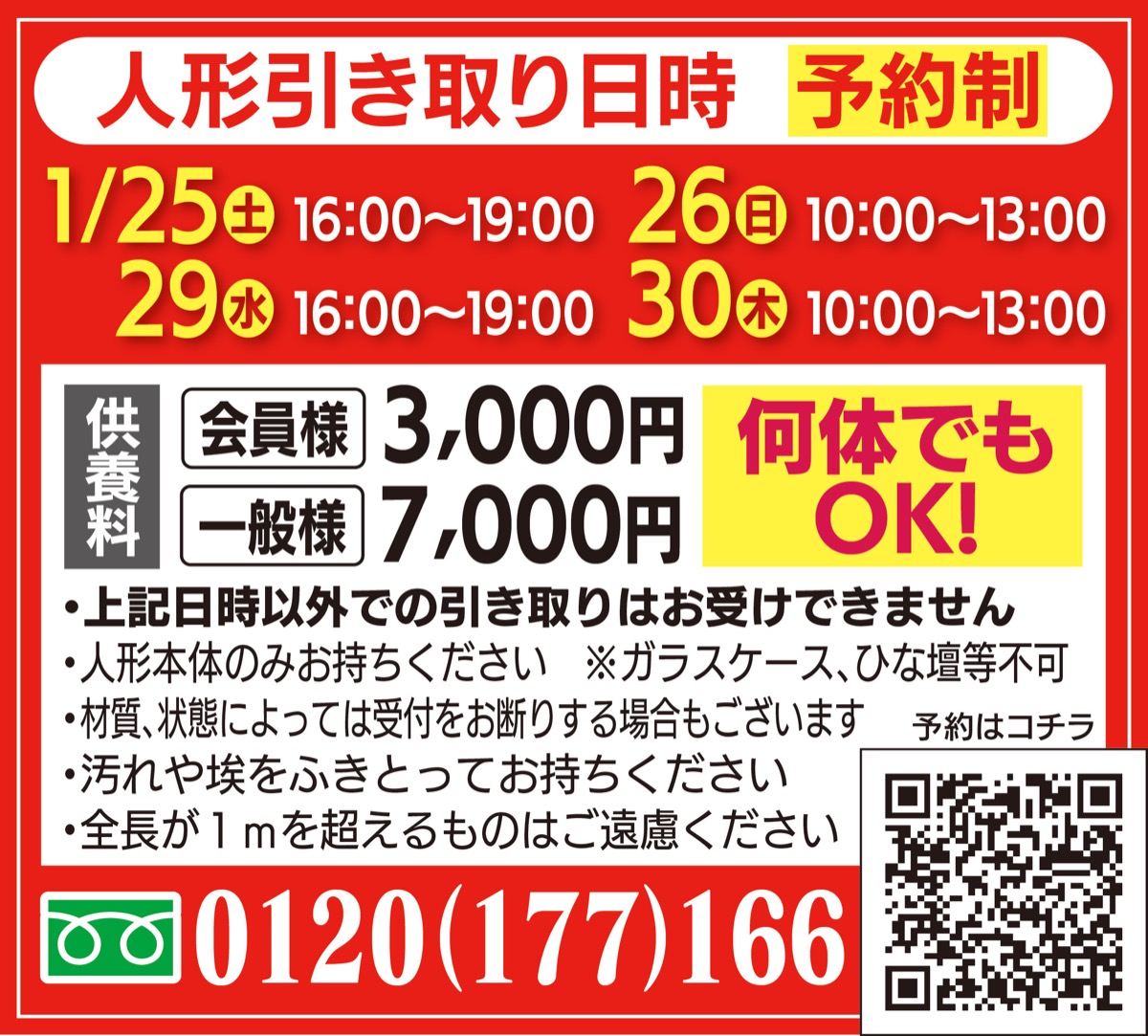「お預りした人形をご住職に供養していただきます」。法要は30日、13時〜(自由参加・入場無料)。参加者には後日供養報告書を送付。供養料は会員3千円、一般7千円。個数制限はなし。
