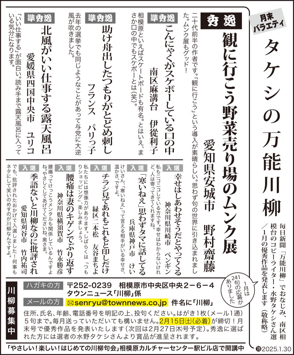 タウンニュース相模原支社では毎月月末号に掲載される「タケシの万能川柳」の川柳を募集しています。投句いただいた作品は毎日新聞「仲畑流万能川柳」などでおなじみの水野タケシさんが選句します。応募方法は枠内に。