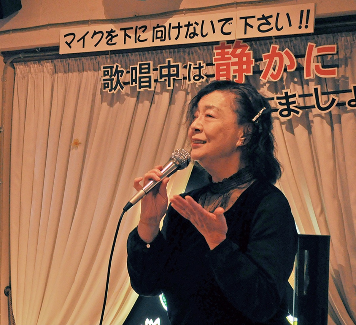区内在住の外間愛子さんはもうすぐ80歳。相模大野の歌声喫茶「花遊」の経営や訪問介護員、更には歌手としての顔を持つ。その活力は若い頃からの経験にあるという。