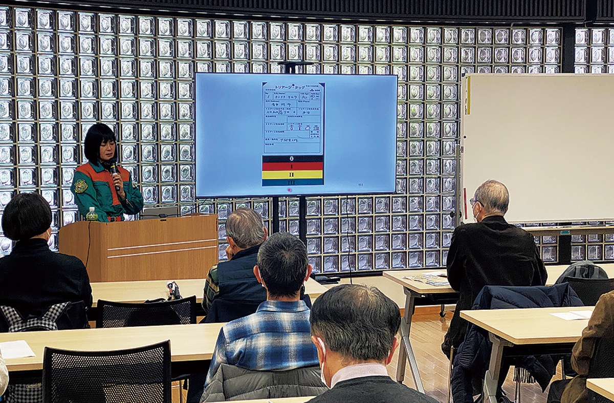 今回は防災士で法政大学兼任講師の正谷絵美さん(市内在住)が登壇し、被災地支援を続ける中での気づきなどを90分にわたり披露。正谷さんは「公的支援(公助)には限界があり、自助・共助が重要である」とし、大規模災害時には消防、警察、自衛隊などの公的機関だけでは対応しきれない現状を伝え、「阪神大震災では実際に救助された人の8割近くは家族や近所の人に助けられている」などと説明した。