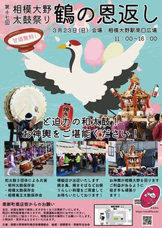 「第17回相模大野太鼓祭り 鶴の恩返し」が3月23日(日)、相模大野駅南口広場で行われる。主催は相模大野南新町商店街振興組合。