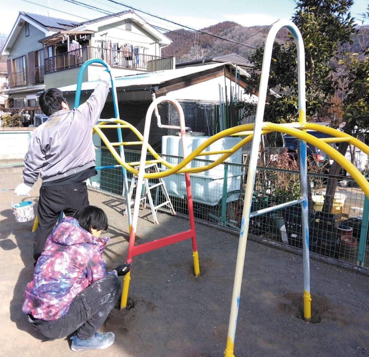 市内を中心とした64社で構成される相模原塗装協同組合が2月16日、緑区内7カ所の公園で塗装の剥がれが目立つ遊具のペンキ塗り直しを行った。