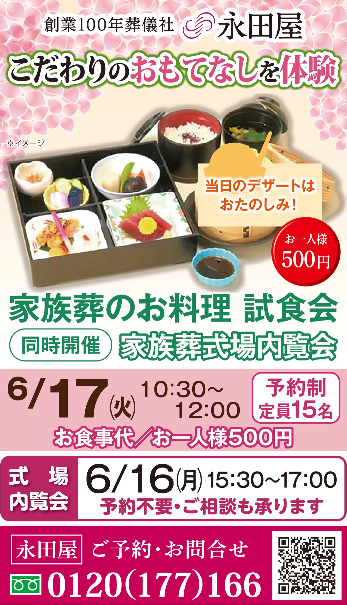 相模原市で創業百十二年目の地元老舗葬儀社・永田屋は「家族葬のお料理 試食会」を6月17日(火)に小さな家族葬ハウス(R)上鶴間で開催する。