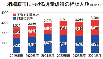 児童虐待の相談人数は全国的に増加が続いている。相模原市は17年、子育ての不安や悩みを相談できる「子育て支援センター」を各区に設置。児童相談所(児相)と同センターで相談(通告)を受け付けている。