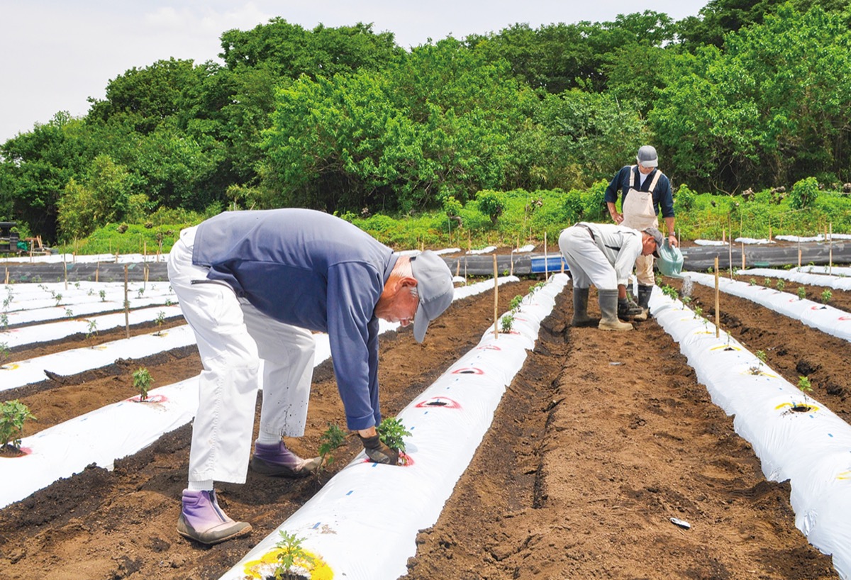 この日は新磯ざる菊愛好会の会長である藤曲和美さんをはじめ、同会の10人のメンバーが作業。4月に予備の畑に植えた苗を本番の畑に植え替えた。
