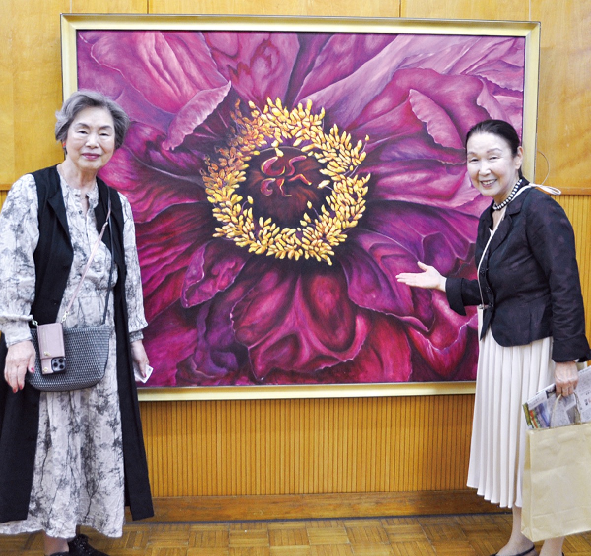女優で画家の左時枝さんは同館にて2年に一度のペースで作品展示を行っている。今回は20点の花の絵が飾られた。
