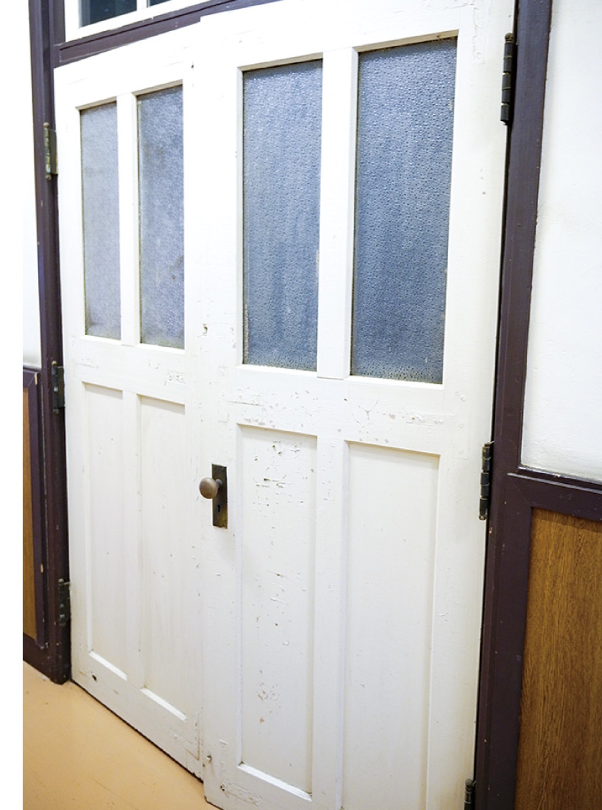 茜館には旧陸軍通信学校時代から変わらない「扉」や「帝専」(帝国女子専門学校)の文字が書かれた窓ガラスが残る。本橋明彦理事は「帝専時代(1948年以前)のガラスでしょう。昔のガラス特有の歪みもあり趣があります」と話す。茜館の素材の一部は相模原市立博物館へ寄贈する予定だという。