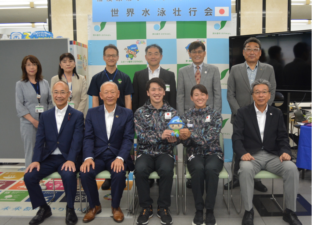 相模原市は7月15日、世界水泳選手権2025シンガポール大会に出場する日本代表選手3人の壮行会を市役所本庁舎で開催した。