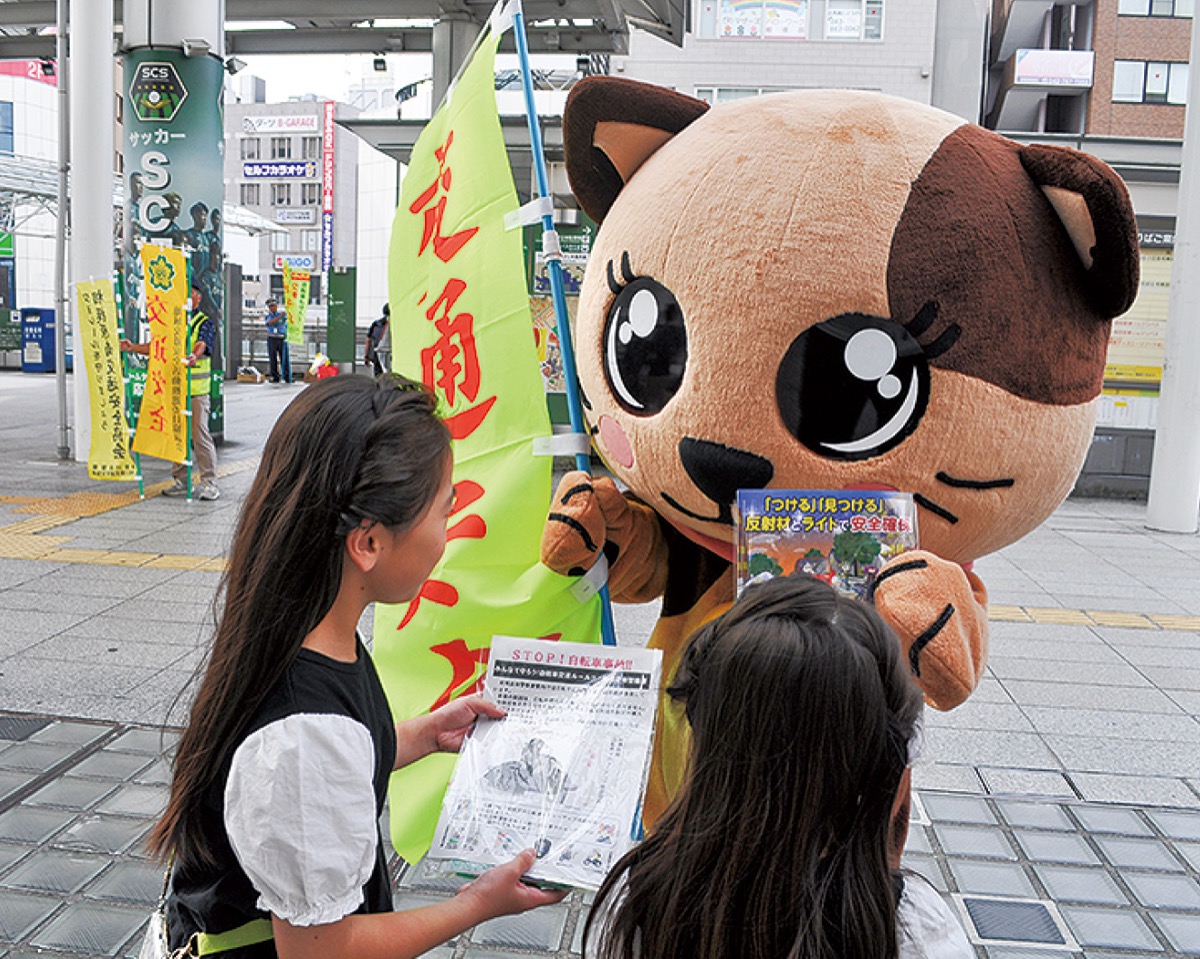 相模大野駅北口ペデストリアンデッキでは県警マスコット猫の「チリカちゃん」が自転車に付けるマルチLEDライトやチラシなどの啓発物を駅の利用者に配布し、交通安全や事故防止を呼び掛けた。相模原南交通安全協会、相模原南交通安全母の会などが参加した。