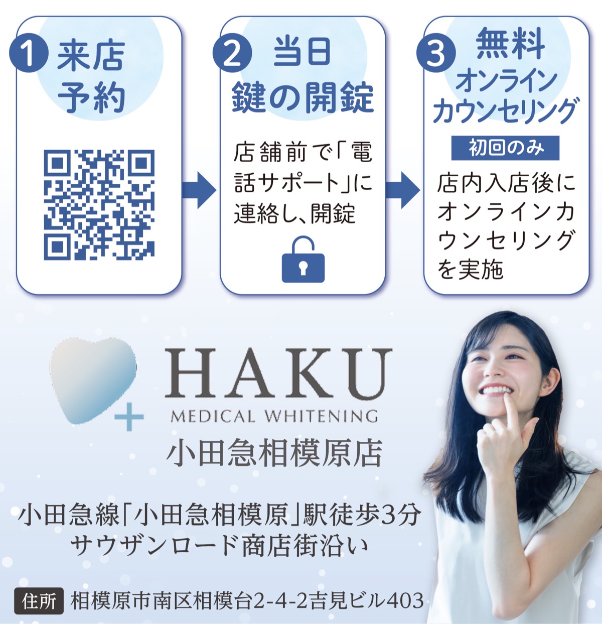 小田急相模原駅から徒歩3分、サウザンロード商店街に今年春オープンした次世代型ホワイトニングサロン「HAKU」。同店は歯科医師と提携し、医療用ジェルを用いたセルフホワイトニングの専門店だ。
