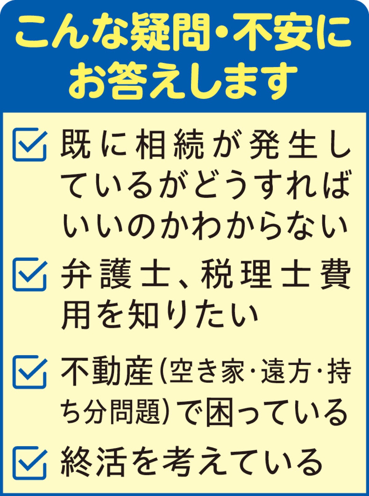 第1部は「相続・遺言」をテーマに遺言書の作り方、遺産分割の進め方、争いにしないための方法を解説。第2部では「相続税・節税」について、今からできる相続税対策5選などを話す。第3部は個別無料相談会を実施。弁護士3人、税理士、司法書士、行政書士、宅建士がさまざまな悩み、疑問に対応。「誰に相談すればいいのかわからない」個人的な相談に応じる。予約優先。