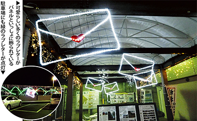 中央自動車道下り線にある藤野PA(緑区小渕2256)に、藤野のシンボル『緑のラブレター』をコンセプトにしたイルミネーションが、先月初旬から点灯され、高速道路利用客から注目を集めている。点灯は2月中旬頃までの予定。同PAは一般道から歩いて入ることも可能だ。