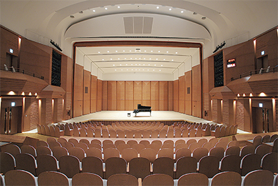 木を基調に設計された「ホール」(=写真/535人収容)は、音響が優れており、出演者からの評価が高い。「音に厳しい」と言われるピアニストの近藤嘉宏さんはレコーディングでこのホールを使ったほどだ。同所ではこれまで辻井伸行さん、小曽根真さん、村治佳織さんら著名ミュージシャンも多数、公演を行なっている。