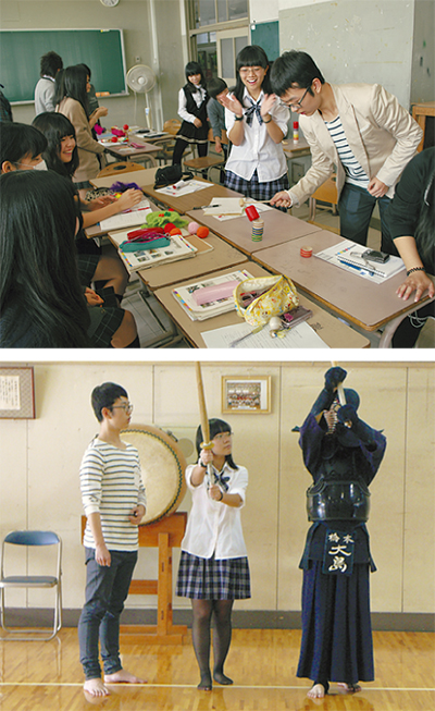 当日、午前中は橋本高校の中国語の授業に参加。グループに分かれて、橋本高校の生徒は中国語で、中国の高校生は日本語で自己紹介した後、中国での学校生活、日本の好きな文化、日本の伝統的な遊びである「けん玉」「だるま落とし」「お手玉」を紹介。同世代ということもあり、すぐに打ち解け、会話が弾んでいた。その後、一行は図書室や授業風景、校内を見学。昼食では、相原高校の生徒が育てた「相原豚」や米を使った豚汁やおにぎりが振舞われ、歓迎・交流会も開かれた。午後からは、橋本高校、相原高校が合同で授業を行っている剣道を見学。途中、日本の生徒たちから竹刀の振り方などを教わっていた。