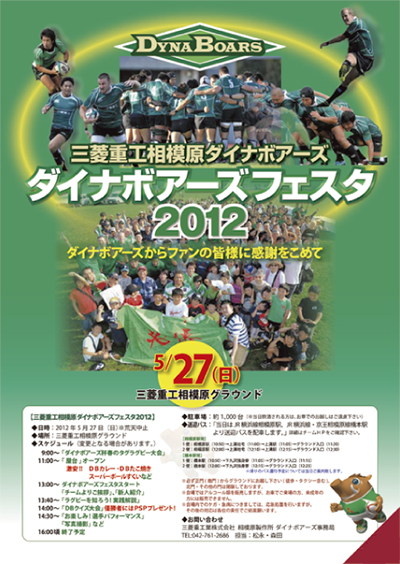 27日(日)には、ダイナボアーズフェスタ2012が午前9時から午後4時まで同グラウンドで開催される。チームからファンに向けて日ごろの感謝を込めて行われる同イベント。当日はタグラグビー大会(午前9時)、チームあいさつや新加入選手の紹介(午後1時)、クイズ大会(同2時)、パフォーマンス・写真撮影(同2時半)など選手と触れ合える楽しい一日に。屋台ではダイナボアーズカレー、たこ焼き、スーパーボールすくいなども並び、子どもも大人も楽しめそうだ。