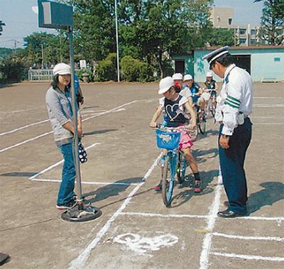 18日に大島小学校で行われた講習では、校庭に教習コースを設定。同校の3年生100人とPTA役員12人が交差点の進行、駐車車両のよけ方、一時停止などを実践しながら走行を体験していた。