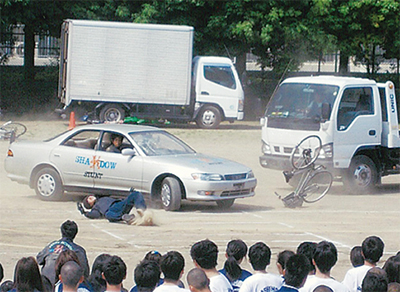 28日には、橋本高校で交通事故疑似体験による教室を実施。走行中の携帯電話やイヤホンの使用、一時不停止などの自転車による道路交通法違反をスタントマンが実演しながら、事故が起きるケースを次々と再現。見学した同校生徒790人の他、相原中学校の生徒130人も、緊迫した事故の再現を固唾をのんで見守っていた。関係者からは「大人がみても迫力がある効果的な訓練だった。子どもたちにも伝わったのでは」と訓練の様子を話す。