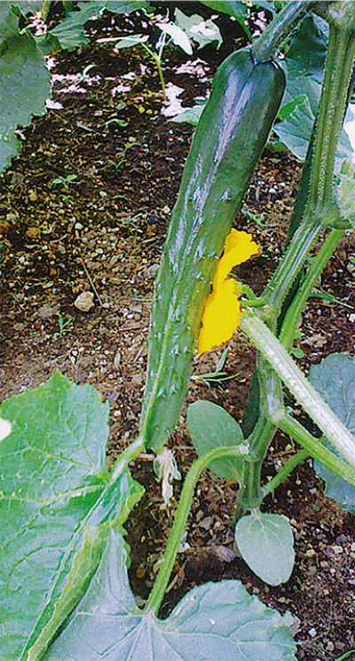 東橋本在住の大石隆次さん宅の家庭菜園で育てていた”キュウリ本体”から、葉っぱ出てきた。