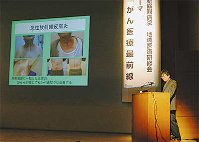 この日行われた研修会では、同院の消化器病センター長の高橋知秀医師を座長に、放射線科治療センター部長の福原昇医師と、消化器病センター外科部長兼外来化学療法センター室長の相崎一雄医師が講演。福原医師は「悪性腫瘍に対する放射線治療の有用性と有害事象」について同院での症例を中心に紹介し、相崎医師は「大腸癌化学療法の新たな方向性と有害事象」を画像を使いながら詳しく解説。会場に足を運んだ医療従事者約30人が両医師の話に耳を傾けていた。