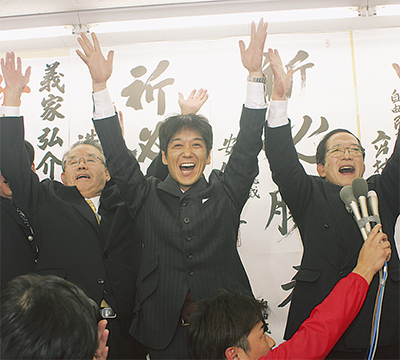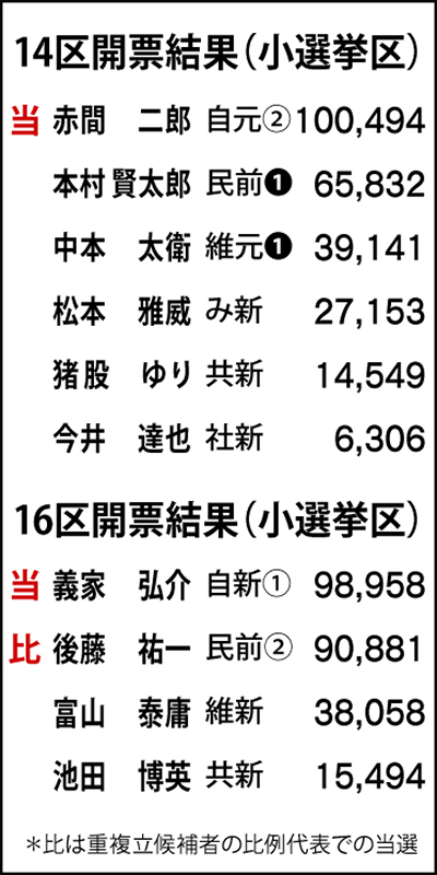 14区では、赤間氏に9時半すぎ「当確」の知らせが届くと、中央区中央の事務所内には大きな歓声と拍手が鳴り響いた。午後10時、赤間氏が支援者らに挨拶。「逆風はあったが、追い風はなかった」と選挙戦を振り返り、「政治の信頼を回復したい」と強く語った。